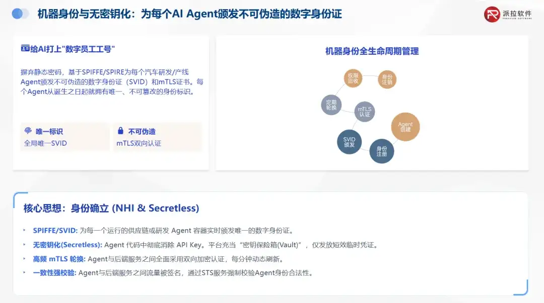 系统可基于 SPIFFE/SPIRE 体系,在 Agent 注册阶段为其颁发短效、动态轮换的物理级身份标识(SVID),并与创建该 Agent 的员工身份进行强绑定;