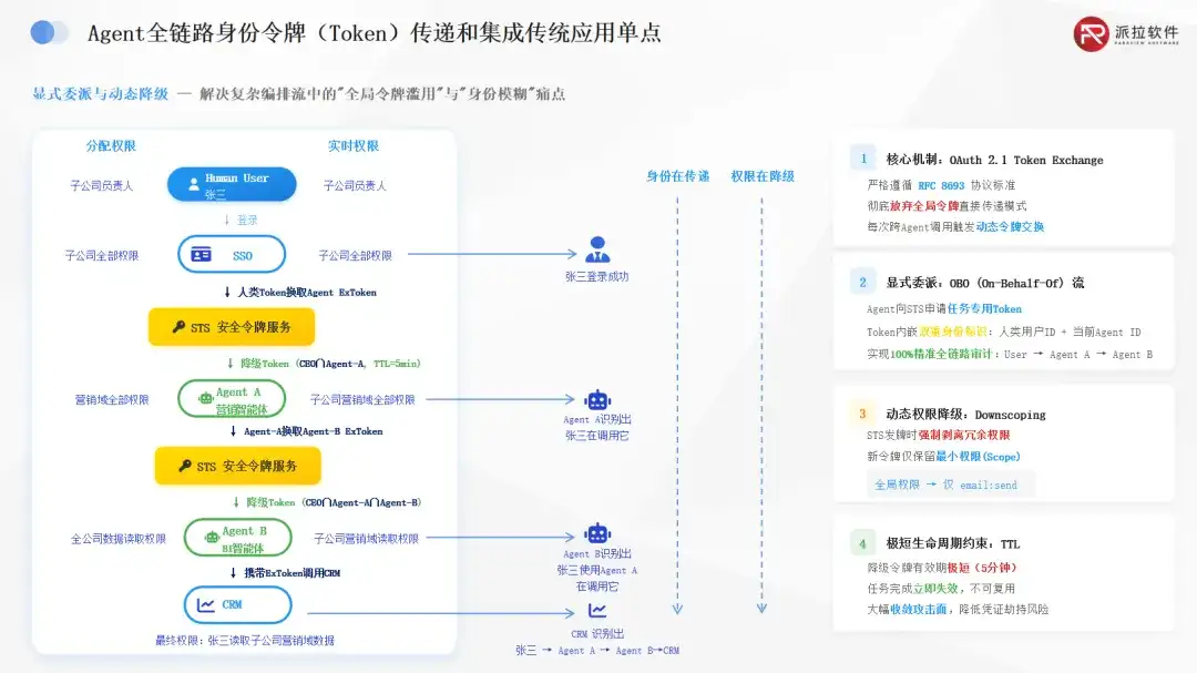 随后,张三通过企业 SSO 登录,STS 校验 IAM 凭证后下发主 Token,Agent 再通过换牌拿到具备查询、更新 CRM 权限的执行 Token_A。