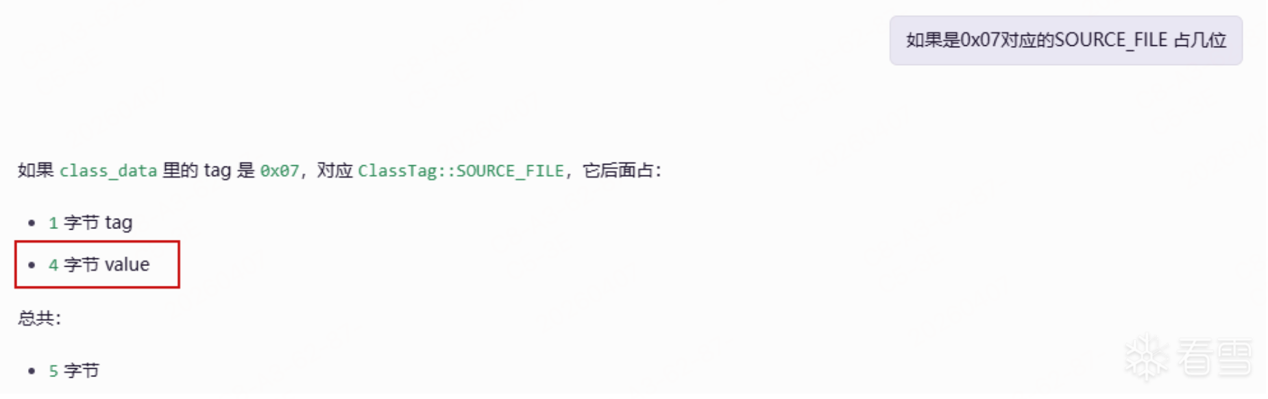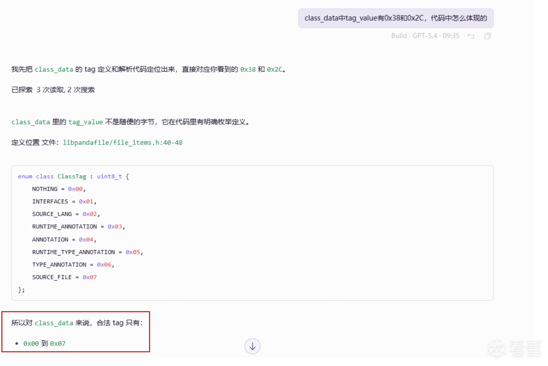 所以class_data的tag根本不存在0x38和0x2C。也就是说当tag等于7的时候,后面的偏移解析错误了。问题很有可能出现在下图中的绿色框中。此时需要确认一下,SOURCE_FILE是占几位。
