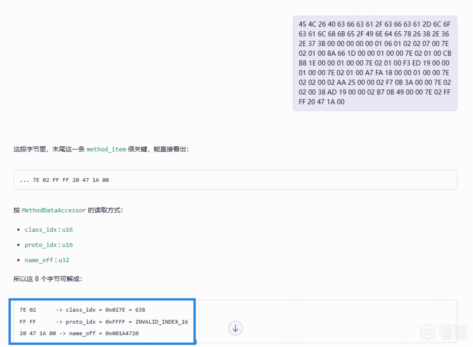 AI可以正确分析这段十六进制值。而且解析出了proto_idx为0xFFFF。但是现实情况并不是这样。因为没有告诉它offset是什么。