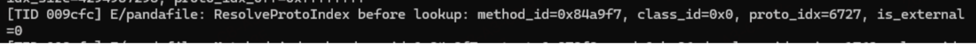 重新运行ark_disasm后,提示F/pandafile: Invalid file offset, from method: GetSpanFromId。很明显,新插入的代码在解析ABC文件时提前中断,导致方法名或类名无法打印。因为重新构造的ABC文件在某处偏移错了。故去掉方法名和类名打印,只打印偏移(methodID),重新编译ark_disasm。