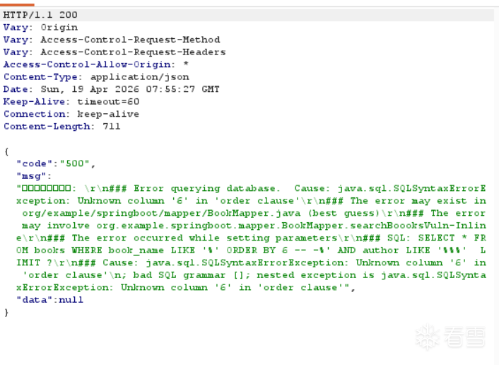 二、SQL 注入漏洞 2.1 漏洞原理 ${} 和 #{} 的区别: @Select("SELECT * FROM books WHERE book_name LIKE '%${bookName}%' AND author LIKE '%${author}%'") 这个是危险的写法 ,${} 是字符串替换,直接把参数拼接到 SQL 里。