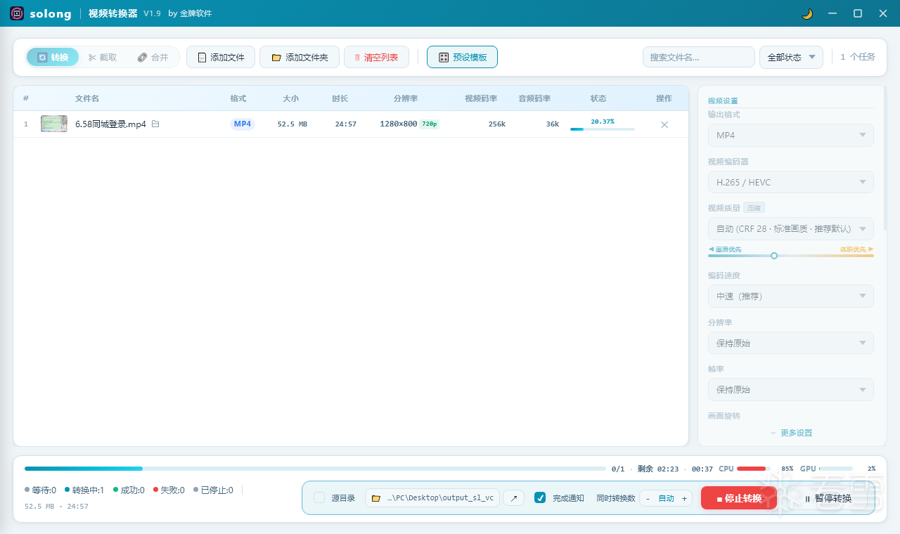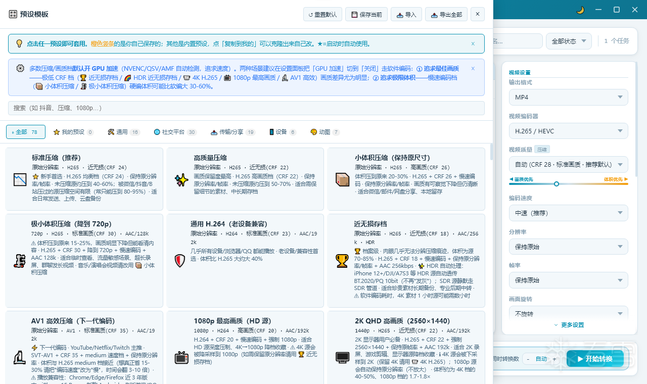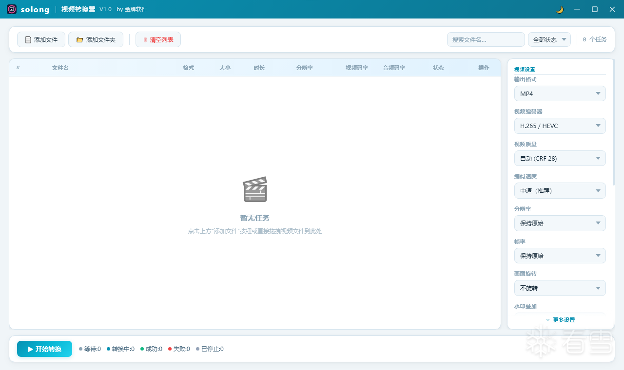免费的视频格式转换工具,支持批量转换,把要转的视频拖拽到软件中,选择输出格式、视频编码、视频质量等功能,即可快速开始转换,最高支持4K转换,界面好看功能强