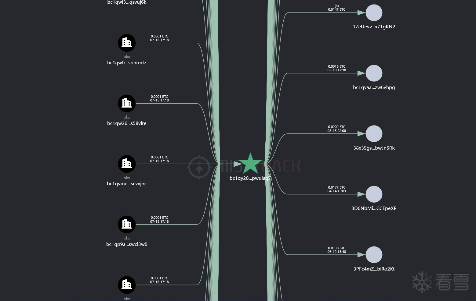 图5 MistTrack平台显示的资金流向图,确证了资金从中间人流向黑客地址
