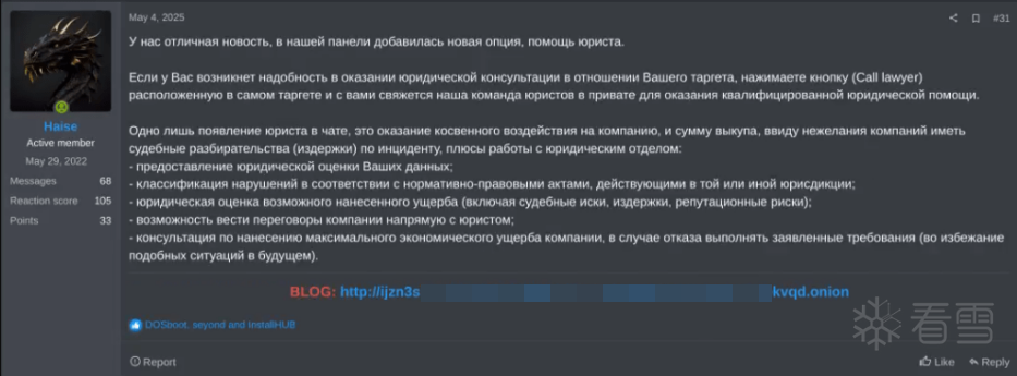 更为致命的是 Qilin 战略层面的“法律武器化”转型。2025年9月,Qilin 在其面板中引入了极具创新性的“Call Lawyer”(咨询律师)功能。该组织不再单纯依赖加密数据进行勒索,而是组建专门团队深度挖掘受害者数据中的合规漏洞,如税务违规、洗钱嫌疑(AML/KYC疏漏)或违反 GDPR 的隐私泄露证据。一旦发现此类“软肋”,Qilin 会撰写专业的“合规评估报告”并起草致监管机构(如 FBI、各国金融局)的举报信。这种策略迫使金融机构在“支付赎金”与“面临监管重罚及牌照撤销”之间做出选择,将勒索攻击提升到了法律博弈的新高度。