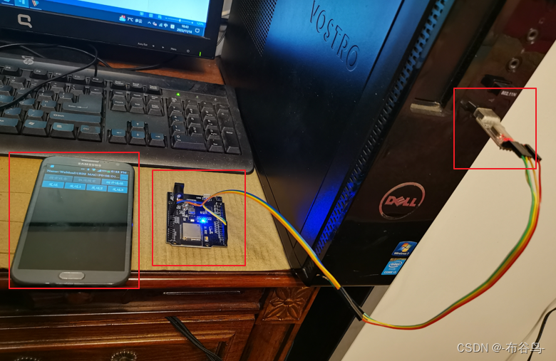 手机,TTL转USB转换器模块,WeMosD1R32开发板,电脑,杜邦线