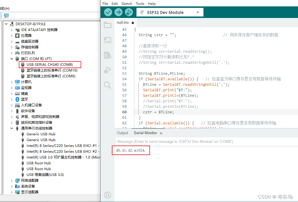 通过手机蓝牙连接WeMosD1R32开发板,开发板又通过TTL转USB与电脑连接.手机通过蓝牙控制开发板上的LED灯的开,关,闪等动作,在电脑上打开串口监视工具观察其状态.也可以通过电脑上的串口监视工具来控制开发板上LED灯的动作,而在手机蓝牙监测工具中显示灯的状态.