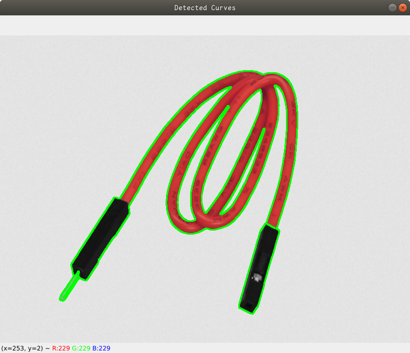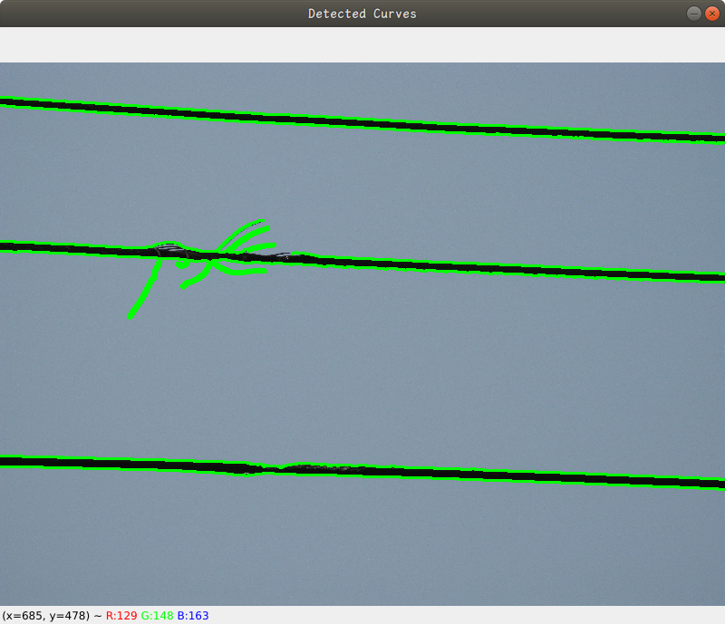 下面是一个需求,识别图片中的导线,要在图像中检测导线,我们需要采用不同于直线检测的方法。由于OpenCV没有直接的曲线检测函数,如同它对直线提供的HoughLines或HoughLinesP,检测曲线通常需要更多的图像处理步骤和算法: