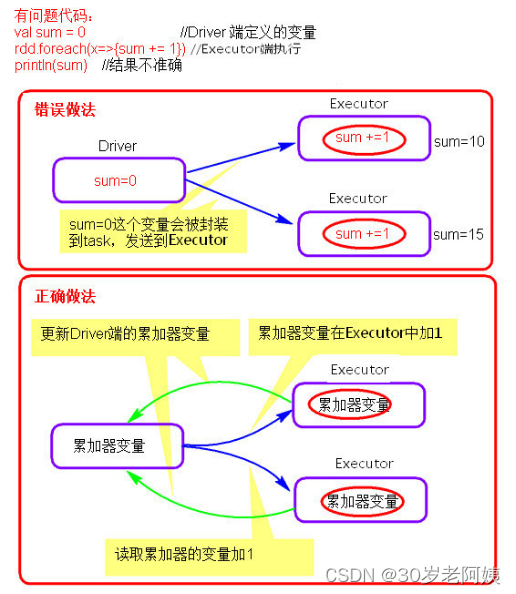 累加器在Driver端定义赋初始值,累加器只能在Driver端读取,在Excutor端更新。