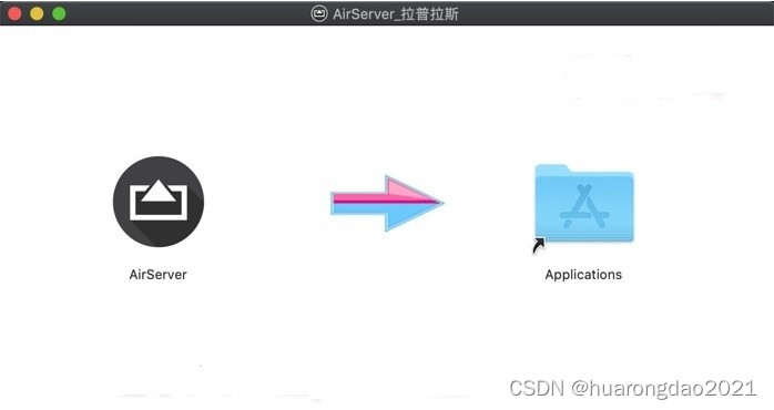 1、软件下载完成后,打开软件包如上图,拖动软件【airserver】到 applications 行安装。