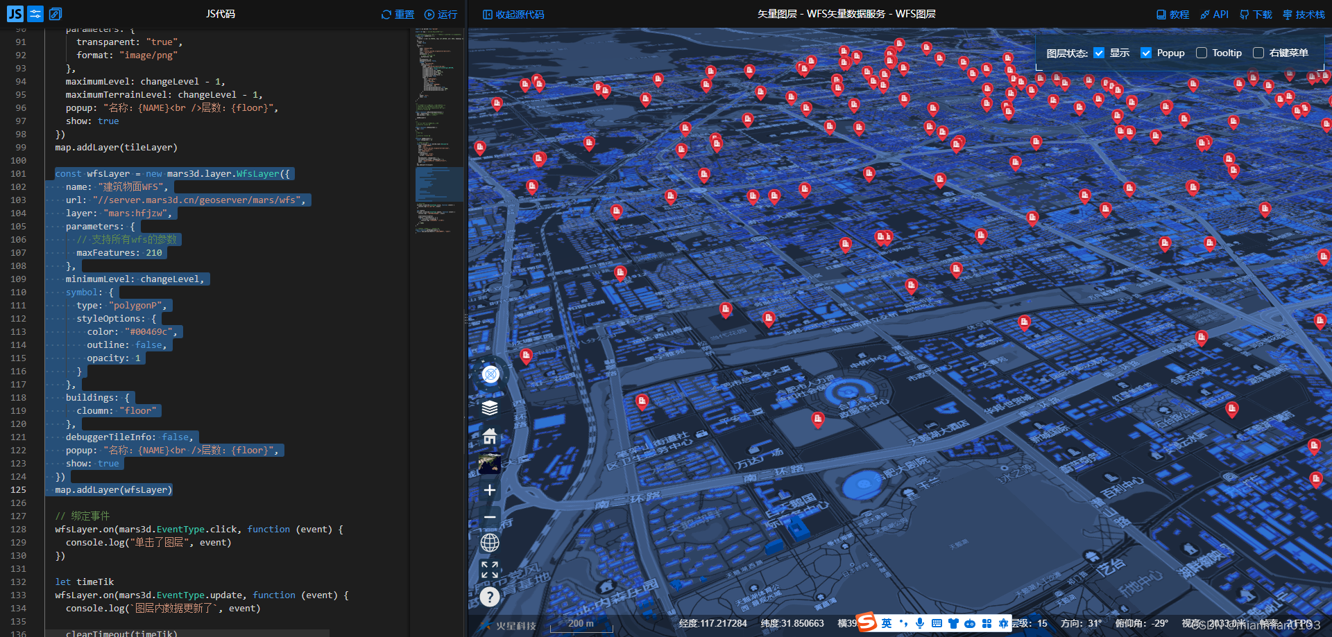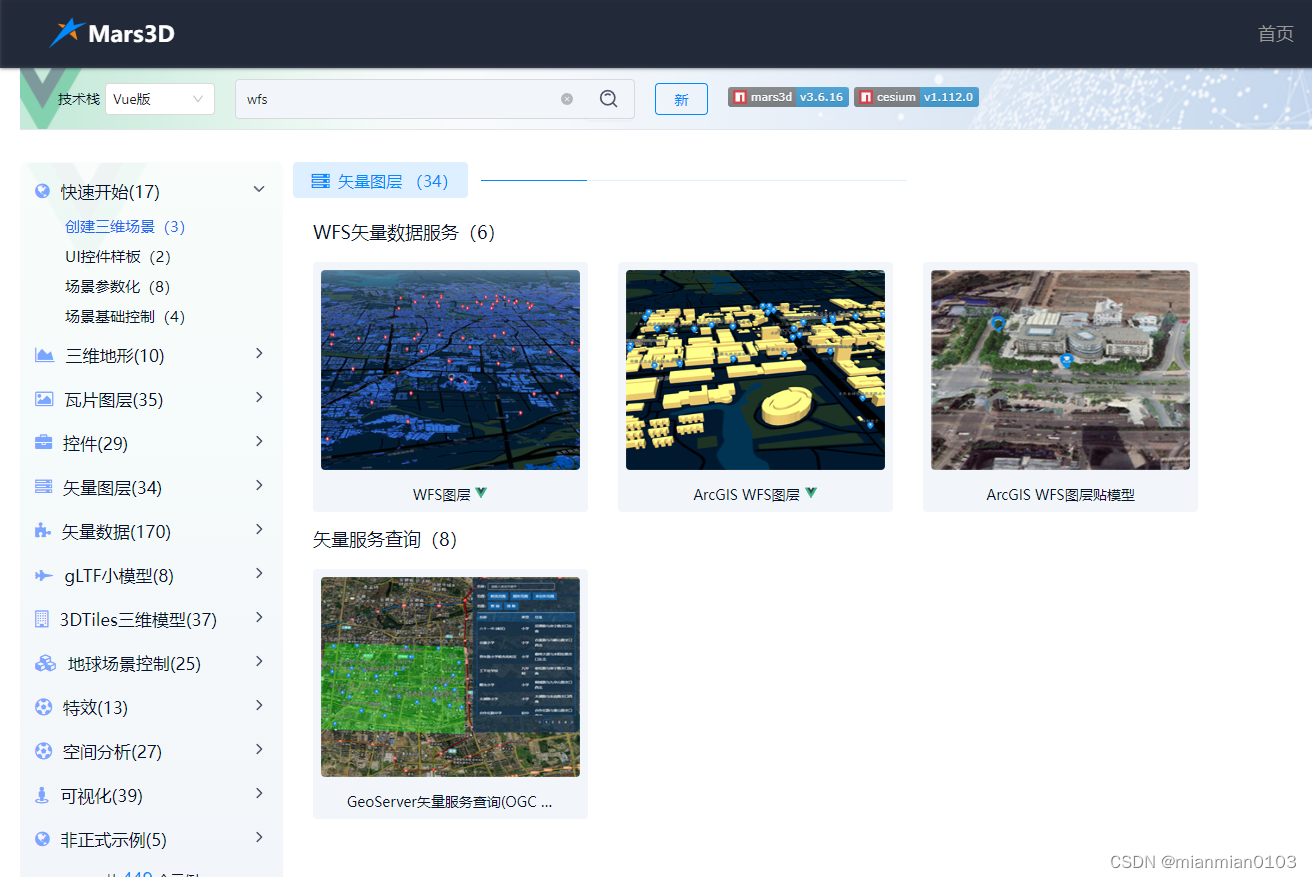 wfs服务的配置案例,在Mars3d的示例中搜索关键字“wfs”即可看到。