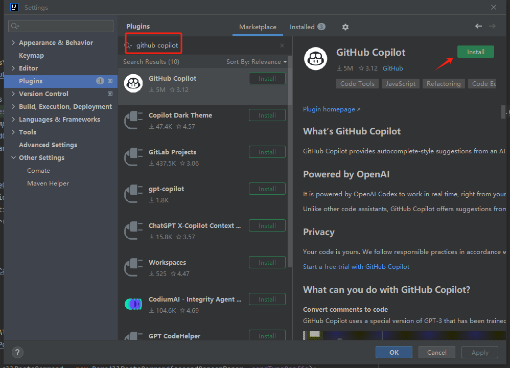 打开 IDEA 的 settings,找到 Plugins,在 Marketplace 中搜索 GitHub Copilot 进行安装。