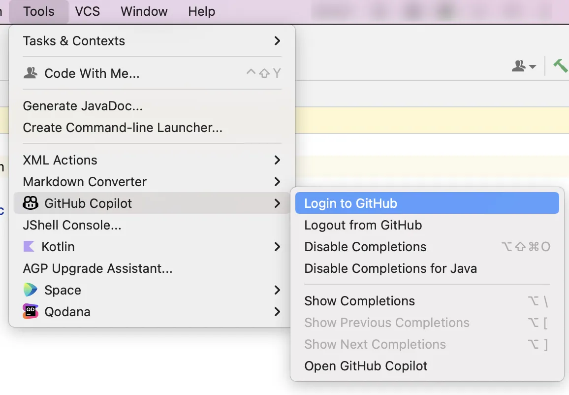 如果没有弹窗的话,也不用担心,单击 IDEA 中的 Tools 菜单。点击 GitHub Copilot,然后点击 Login to GitHub。