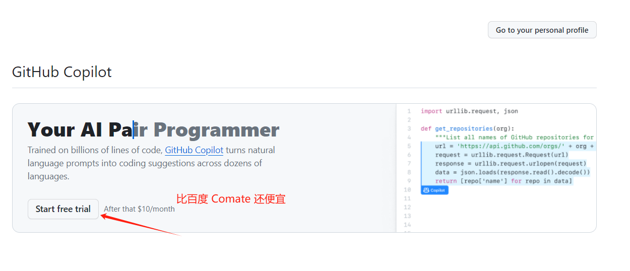 土豪随意,一个月 10 刀,比百度的 Comate 还便宜点(百度 Comate 要一个月 100 软妹币)。