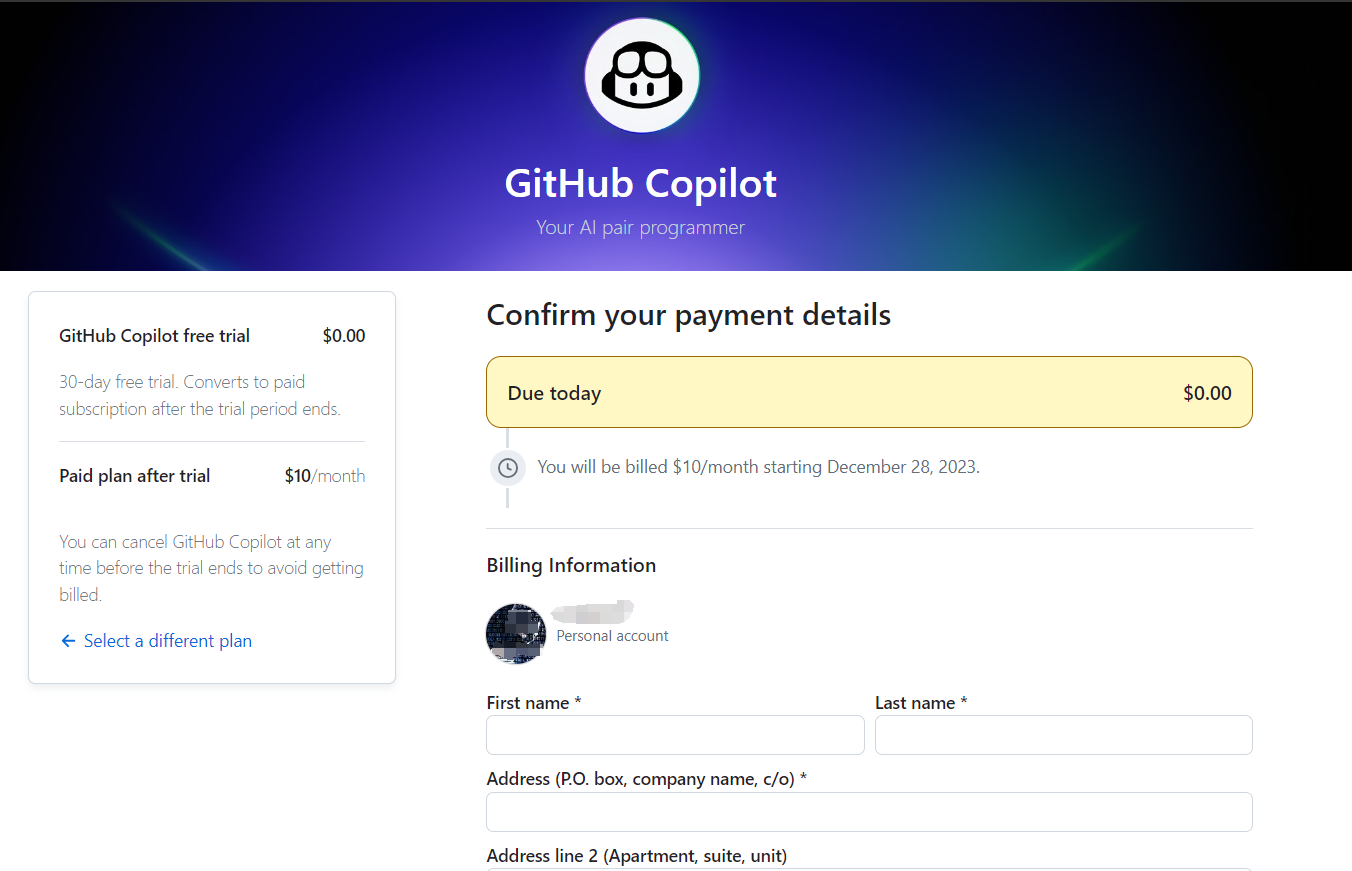 在浏览器登陆 GitHub 账号之后,我们选择 Start free trial 进行一个月的免费试用。