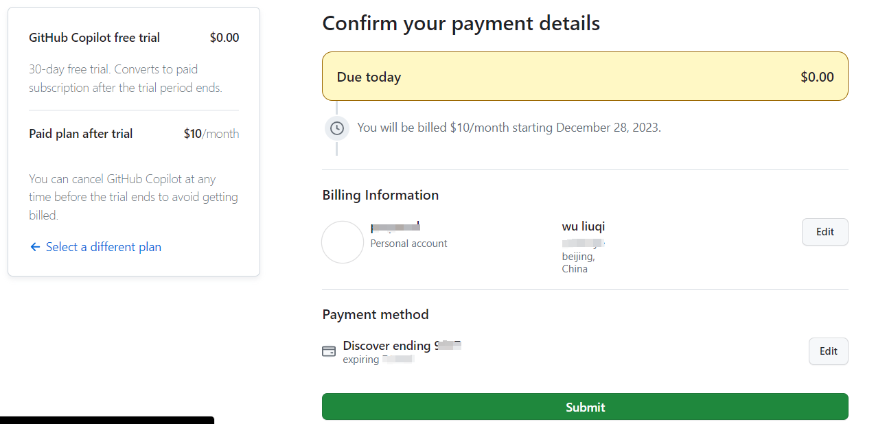 之后会要求我们输入信用卡信息,我们输入好点击提交即可。