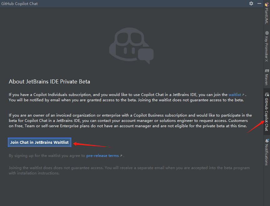 要注意的是,GitHub Copilot Chat 现在在 Intelli IDEA 还在 Beta 验证中,大部分不能使用,但是我们可以点击链接先排个队!