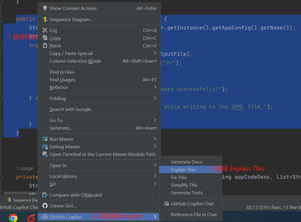 操作流程:1)选择你的 Java 方法代码;2)右键选择 GitHub Copilot;3)选择 Explain This。