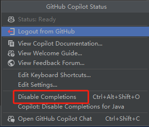然后点击 Disable Completions 就可以关闭 Copilot 推荐。