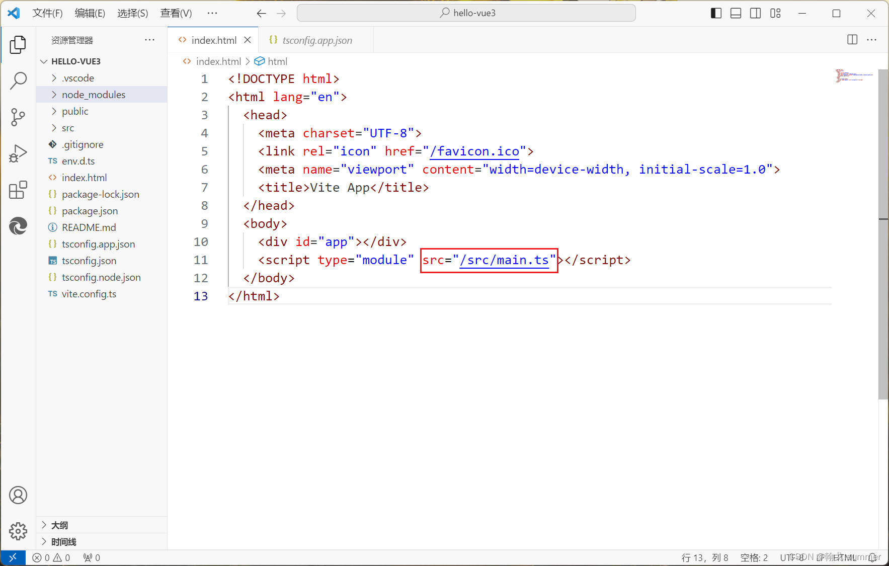 在入口文件index.html中,引入了src目录下的main.ts文件。