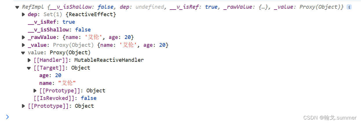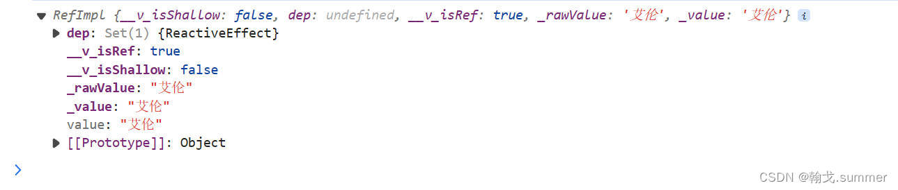 可以看到是一个RefImpl对象,name的值变成了这个RefImpl对象中的属性value的值。所以在案例中我们用name的值是用name.value,但是在插值语法中是不用.value的。