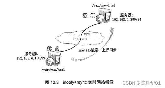 某公司在深圳、北京两地各放置了一台网站服务器,分别应对南北大区内不断增长的客户访问需求,两台服务器的网站文档必须保持一致,如图12.3所示,同步链路已通过VPN专用线路实现。