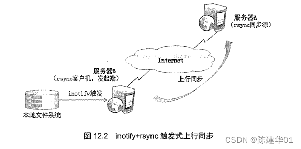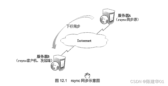 有了同步源服务器之后,就可以使用rsync工具来执行远程同步了,本节介绍的备份操作均在客 户机(发起端)执行,如服务器B(图12.1),实际上,同步源与发起端可以是同一台主机(当然这 种情况不常见),其效果相当于本地备份而不是异地备份。