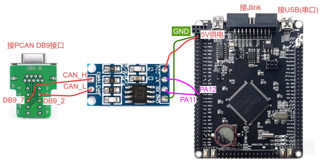 TJA1050 的 RX 接 STM32 的 PA11,TX 接 STM32 的 PA12,VCC 接STM32 的 5V,GND 接 STM32 的 GND
