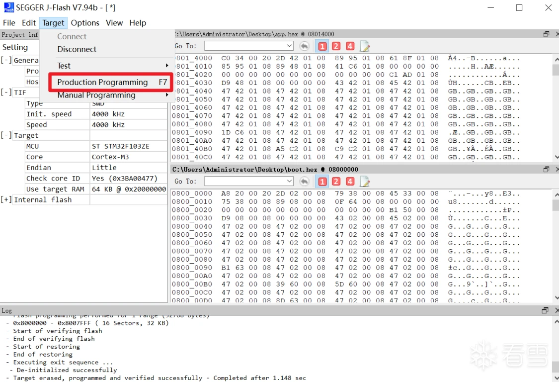 把两个固件都拖到右边的数据文件窗口,然后点击 Target -> Production Programming 烧写固件(hex 文件都是记录着地址信息的,直接烧录即可)
