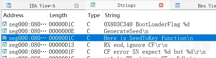 那么切换到扩展会话 7DF # 02 10 03,然后发送维持会话 7DF # 02 3E 80,再次请求便可得到种子,但是我们并不知道怎么从种子算出密钥呀,这时候就要反编译固件分析逻辑了,可以把 app.hex 拖到 IDA 里面以 ARM 小端格式打开,搜索字符串,我把 SeedToKey 字符串加在了代码里方便定位