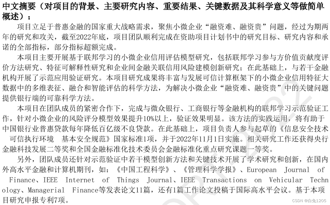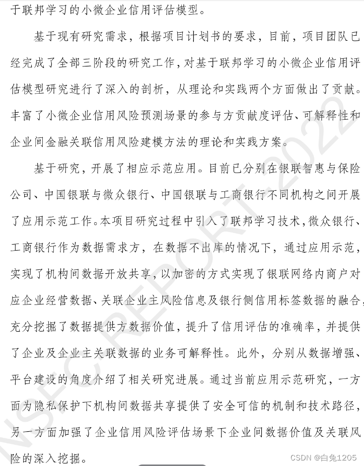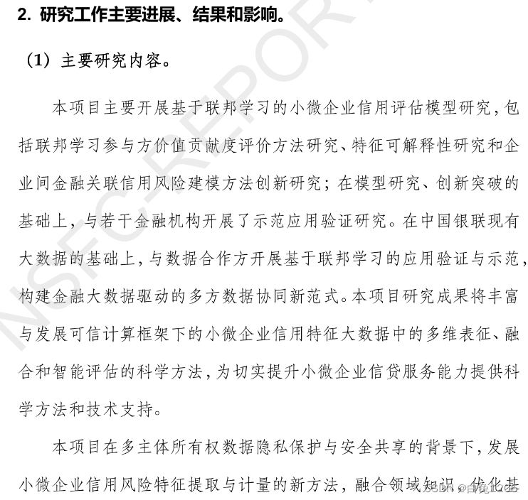 (1)基于联邦学习的中小企业信用评估模型研究,包括联邦学习参与方价值贡献度评价方法研究、特征可解释性研究和企业间金融关联信用风险建模方法;