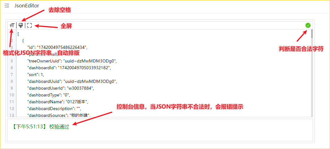 这个JSON编辑器不仅能够让你方便地格式化JSON字符串,还能帮你去掉不必要的空格。而且,它的全屏功能让编辑更加顺畅。最酷的是,它还能实时告诉你格式化的进度,如果遇到问题了,控制台会详细告诉你哪里出错了,这样你就能快速找到问题并解决它。编辑器还能精确地计算行号,这对于查找问题也是很有帮助的。而且,它还有自动补全、自动删除和括号匹配这些贴心的功能,让你的编辑工作变得更加轻松。如果你不小心做错了,也不用担心,因为它支持撤销和重做。希望它能帮助到大家,让我们的工作更加愉快!