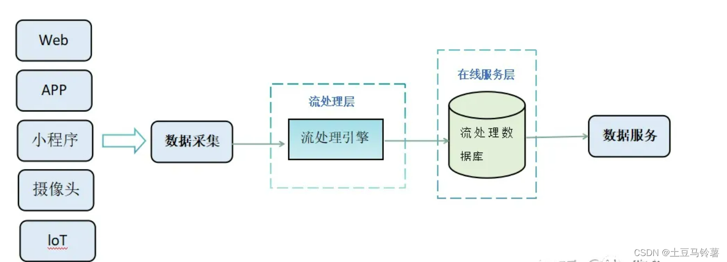 这种架构只关注流式计算,数据以流的⽅式被采集过来,实时计算引擎将计算结果放⼊数据服务层以供查询。可以认为Kappa架构是Lambda架构的⼀个简化版本,只是去除掉了Lambda架构中的离线批处理部分。