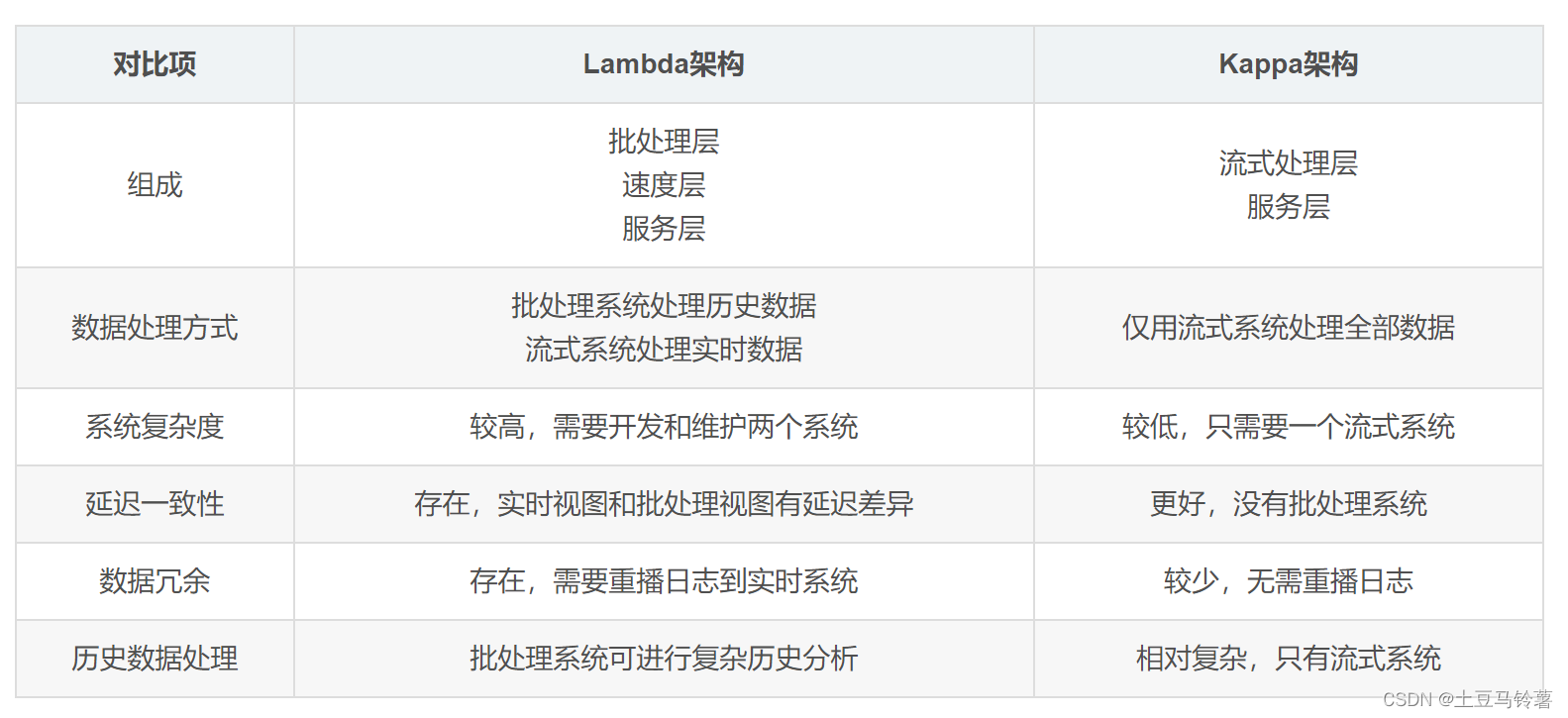 Kappa架构只通过流式系统实现所有处理,简化了架构,但历史数据分析相对复杂,需要流式系统保证精确一次语义。