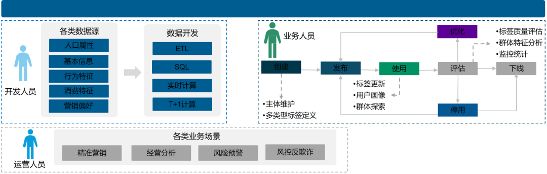 标签建设开发、生命周期管理、标签应用为一体,支撑企业差异化的标签画像服务和运营需求;通过标签开发、管理、更新、监控、用户画像赋能企业更好的洞察客户需求、防控业务风险、提高服务质量和效率。