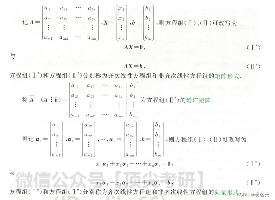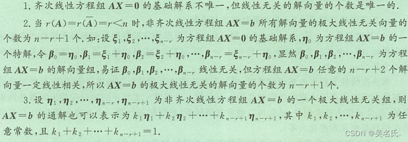 (2)通解——设ξ1,ξ2,…,ξn-r为齐次线性方程组AX=0的一个基础解系,则称k1ξ1+k2ξ12+…+k(n-r)ξ(n-r),为齐次线性方程组AX=0的通解,其中k1,k2,…,k(n-r)为任意常数.