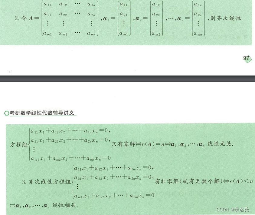 (2)齐次线性方程组AX=0 有非零解(或有无数个解)的充分必要条件是r(A)<n