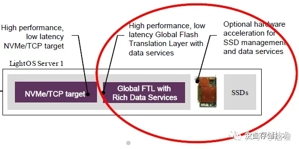 在《VMware vSAN下一目标:NVMe-oF存储扩展?》中我曾列出过上面这张图,Lightbits使用一张FPGA卡来跑NVMe/TCP target和全局FTL等数据服务。这个要想大规模普及,估计离不开initiator端网卡的优化支持。