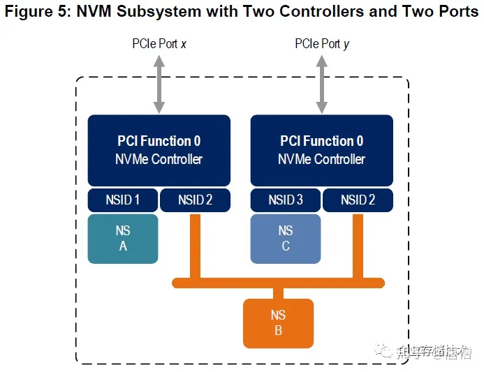上图是一个双控制器/双端口的NVM子系统示例,在EMC DSSD之后,使用PCIe直连服务器和存储阵列的应用估计寥寥无几,所以该子系统基本上代表了双端口NVMe SSD 和JBOF机箱的设计。比如这里的NS(NameSpace)B,就可以通过2个NVMe控制器同时提供前端访问。
