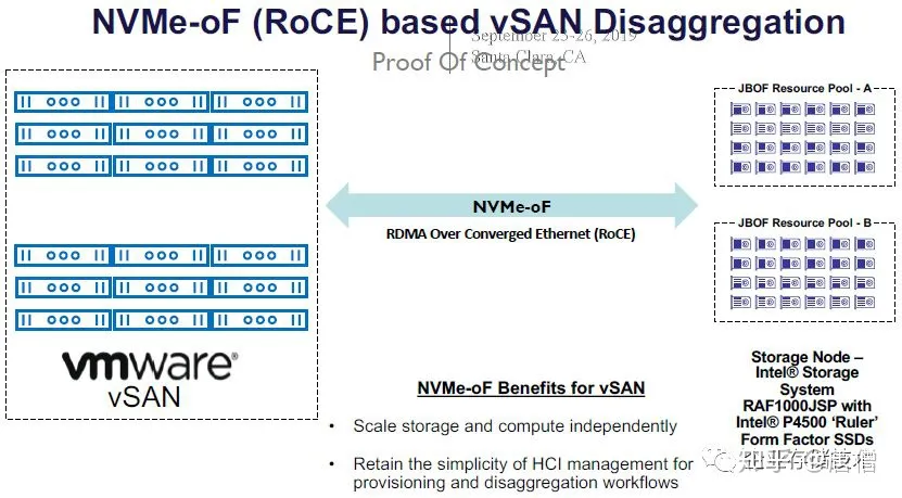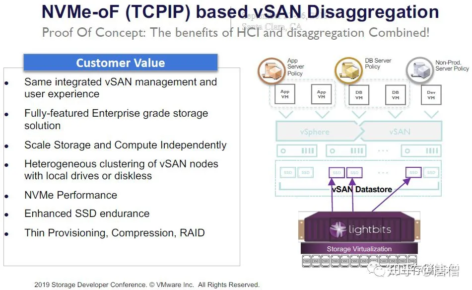那么vSAN在计划中之所以能支持NVMe-oF,应该是将计算节点与JBOF/Lightbits解耦的原因,服务器节点更像是SDS管理网关的感觉。同时带有本地盘的服务器节点也能一起组成异构集群。