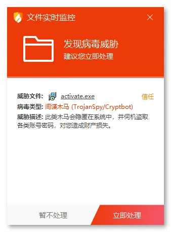 近期,火绒威胁情报系统发现一款伪装成Windows非法激活程序的窃密病毒正在传播。该病毒以Windows_Loader.zip包形式诱导用户,内含病毒程序,可以获取用户电脑和程序信息并且盗取资金,对用户构成较大安全威胁。目前,火绒安全产品已对该病毒进行拦截和查杀,建议用户及时更新病毒库以提高防御能力。