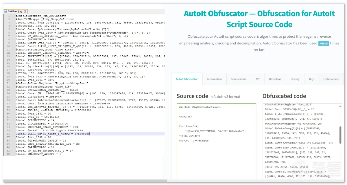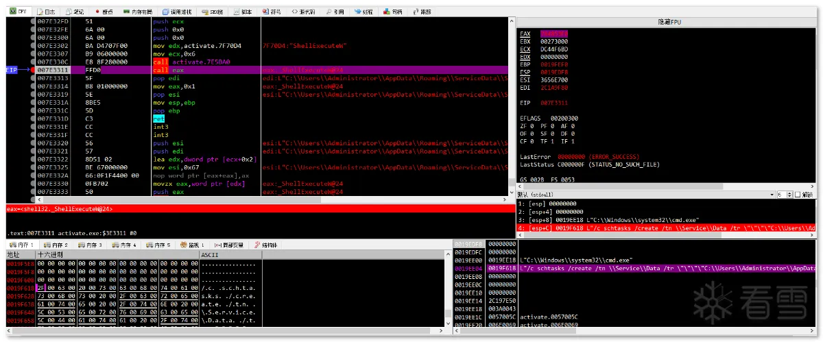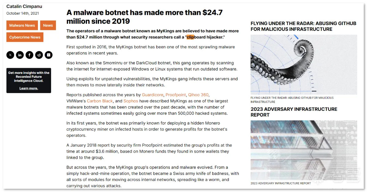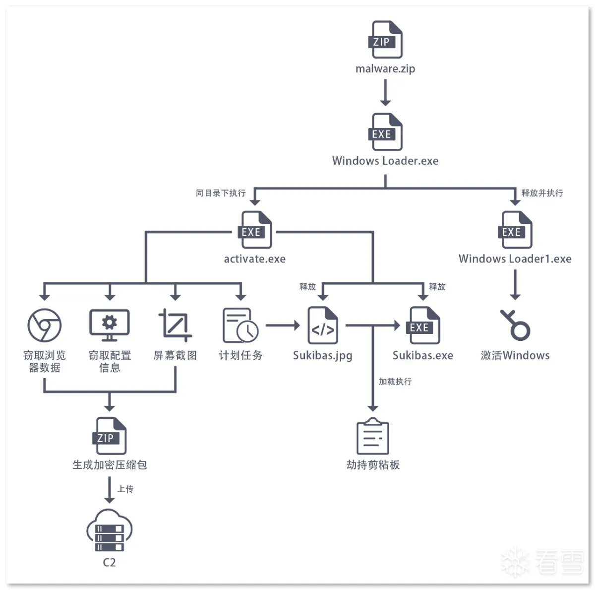 第一阶段:样本是一个名为 Windows_Loader 的文件夹,其内包含多个文件,伪装成 windows 激活程序来欺骗用户: 文件集合以 "Windows Loader.exe" 为执行主体,这是一个自解压的可执行文件,内部包含用于激活 windows 用的 Windows Loader1.exe,Keys.ini 文件是激活用的序列号,这里最高只支持到 Windows7: Keys.ini 和 sfx 自解压双击启动 "Windows Loader.exe" 后,其会先后执行同目录下的 activate.exe 和释放的 Windows Loader1.exe,其中恶意行为集中在 activate.exe 中: 进程启动第二阶段:activate.exe 是一个近 700M 的大文件,逻辑代码包含大量混淆、 SMC、动态加载等操作及近乎全局的内存校验反调(反软件断点): SMC内存校验计算 hash 的过程中,如果遇到内存修改或调试用的软件断点,则校验失败,从而跳转到报错弹框中并结束程序: 报错弹框样本在运行过程中会在 rdata 区解压出通用的数据,数据的内容展现出其要窃取的信息以及要上传的格式: 解压 rdata 段数据通过配置字符串及调试验证可以发现,其窃取信息包括主流的浏览器相关的配置、钱包、关键插件、用户数据等: 窃取 chrome 示例窃取的浏览器列表如下: 浏览器列表对于浏览器数据的获取方式,样本会根据配置数据遍历并复制指定的配置文件到内存中,用于后续打包上传: 获取 Chrome 配置文件示例除了窃取浏览器相关数据外,样本还会获取受害者电脑的相关信息,包括“用户名、时间、操作系统、键盘语言、CPU、RAM、GPU”等。此外,样本还会遍历注册表 "HKLM\SOFTWARE\Wow6432Node\Microsoft\Windows\CurrentVersion\Uninstall" 和 "HKLM\SOFTWARE\Microsoft\Windows\CurrentVersion\Uninstall" 获取 32 位和 64 位已安装的用户程序: 已窃取的信息列表在窃取受害者相关信息后,样本会新开辟一个内存空间用于存放数据,并解密出后续操作需要的字符串,包括前面 .rdata 区未出现的 information.txt,screen.jpg,以及 fAyc127FnH9rd0NqvpI7 等。其中 Information.txt 用于存放前面提到的受害者用户信息,screen.jpg 用于后续拍摄屏幕截图,fAyc127FnH9rd0NqvpI7 则是将所有窃密数据以文件为单位存放后,对文件夹进行压缩时的压缩密码: 窃密压缩包在整理好窃密信息到内存压缩文件,样本会解密出要连接的 C2:"gjseven7vs.top" 作为回传域名,发送的目录及其它 http 字段都在前面 .rdata 段中有定义: 域名连接 流量包截获随后样本会解密嵌在自身中的 Sukibas.exe 和 Sukibas.jpg 文件,释放在 "C:\Users\Administrator\AppData\Roaming\ServiceData" 目录下,以供下一阶段使用: 文件释放样本继续解密出关联的命令参数,并调用 ShellExecuteW 函数来执行 cmd 命令以注册计划任务,执行的命令如下所示:"/c schtasks /create /tn \Service\Data /tr """"C:\Users\Administrator\AppData\Roaming\ServiceData\Sukibas.exe""" """C:\Users\Administrator\AppData\Roaming\ServiceData\Sukibas.jpg"""" /st 00:01 /du 9800:59 /sc once /ri 1 /f" 注册计划任务 计划任务截图第三阶段:第三阶段属于写在计划任务中的 Sukibas.exe 和 Sukibas.jpg 中的执行过程,Sukibas.exe 是 Autoit 官方的脚本加载器: 信息查看Sukibas.jpg 则是一个经过混淆的 Autoit 语言编写的脚本,经过对比,可以确认利用的混淆工具是 "Autoit Obfuscator" 这款工具: 混淆工具由于该脚本没有使用任何 Autoit 的导入库,所以可以把调用的函数范围限制在标准函数列表中。且该混淆工具对函数的混淆策略是将函数分配给变量来隐藏调用的函数信息,所以仔细搜寻就能发现 3 个关键的标准函数,Run、ClipGet、ClipPut。 Autoit Obfuscator由于没有外联类函数的调用,结合相关威胁情报及该组织的 TTP,可以猜测出其是使用了一种叫 "clipboard hijacker" 的模块。该模块曾在 2019 年由研究人员在 MyKings僵尸网络中发现,其原理是通过劫持用户剪贴板数据,对受害者复制的数据进行正则匹配,筛选出类似于加密货币地址的文本字符串,最后将其替换为自己的钱包地址,以吸走资金。 相关报告截图该手法在 Sukibas.jpg 上得以验证,样本在获取剪粘板数据中不断循环,直到匹配出类似于加密货币地址的文本字符串: 获取剪粘板数据获取匹配的剪粘板数据后,样本会用自己内置的钱包地址进行替换。替换地址随加密货币的种类不同而不同,有比特币、以太坊、Tron等: 比特币地址替换额外的,在替换钱包地址后,样本会执行一个自删除操作,为了防止由于 Sukibas.exe 正在执行而无法删除,样本还特定延迟两秒后才进行相关操作。执行的命令如下:"C:\Windows\system32\cmd.exe /c timeout /t 2 & del /f /q "C:\Users\Administrator\AppData\Roaming\ServiceData\Sukibas.exe" & del /f /q "C:\Users\Administrator\AppData\Roaming\ServiceData\Sukibas.jpg"" 文件删除
