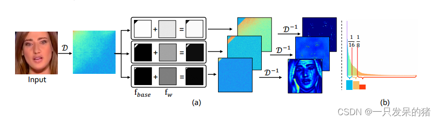 图3(b)展示了DCT功率谱的分布。通过将2D功率谱展平为1D表示,通过对每个频率带的振幅求和。