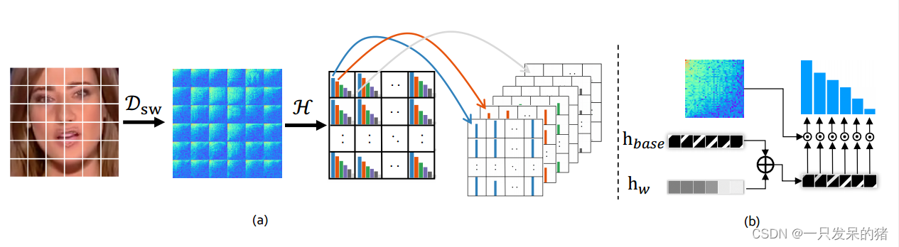 如图4(a)所示,我们首先对输入的RGB图像应用滑动窗口离散余弦变换(Sliding Window DCT,SWDCT),即在图像的滑动窗口上密集地进行离散余弦变换,以提取局部的频率响应。然后,在一系列可学习的频率带上计算平均频率响应。这些频率统计信息重新组合成一个多通道的空间映射,与输入图像具有相同的布局。这种局部频率统计提供了一个定位的窗口,用于检测详细的异常频率分布。在一组频率带内计算统计信息可以减少统计表示的复杂性,同时产生一个更平滑的分布,不受异常值的干扰。