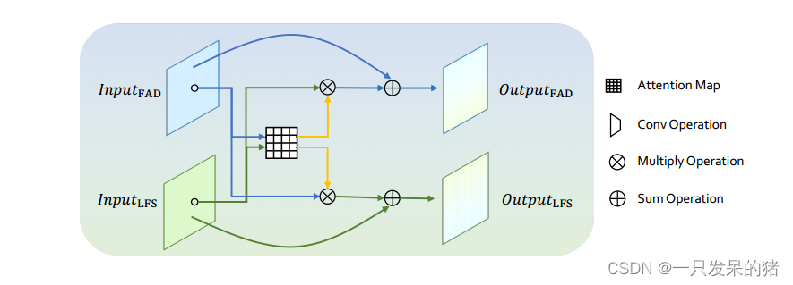 我们提出了一个交叉注意力融合模块,用于特征交互和信息传递,每隔几个Xception块进行一次。与先前方法中广泛使用的简单连接不同,作者首先使用来自两个分支的特征图计算交叉注意力权重。