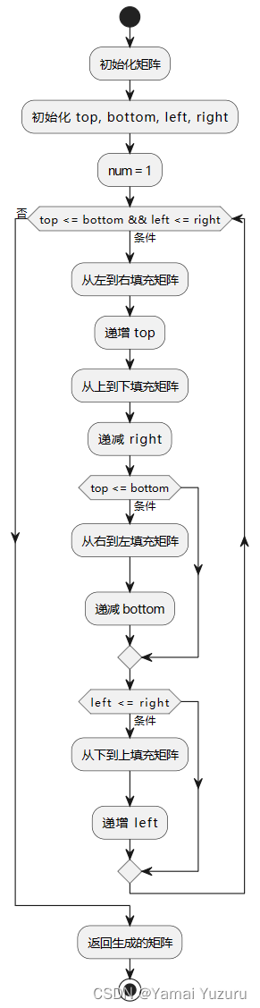本质上,这段代码通过模拟顺时针填充矩阵的过程,利用循环和边界指针的调整,逐步生成顺时针螺旋矩阵。这是一种常见的矩阵操作,通过巧妙的控制循环和边界指针,实现了一个相对简洁而高效的算法。